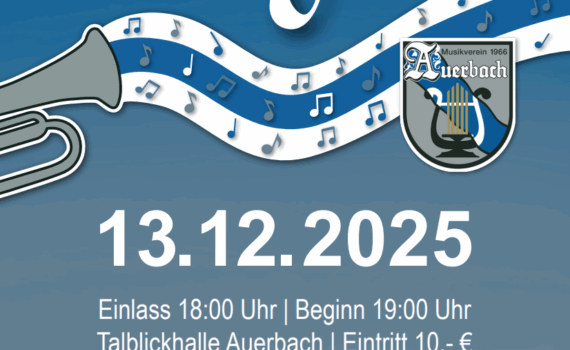 Einladung zum Winterkonzert des Musikverein 1966 Auerbach Der Musikverein Auerbach lädt herzlich ein zum diesjährigen Winterkonzert am Samstag, den 13. Dezember 2025 in der Talblickhalle Auerbach. Einlass ist ab 18:00 Uhr, das Konzert beginnt um 19:00 Uhr. Freuen Sie sich auf einen festlichen Konzertabend mit einem vielfältigen musikalischen Programm. Es […]